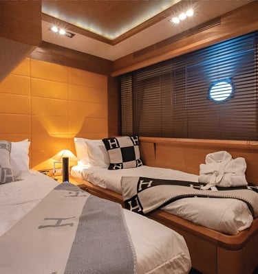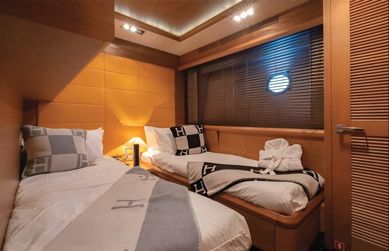 Relax in comfort with our cozy Twin Bed Suite, perfect for friends or family traveling together. This thoughtfully designed cabin features two comfortable twin beds, ample storage, scenic views - all aboard a charming boat settling. Ideally for a restful stay on the water
